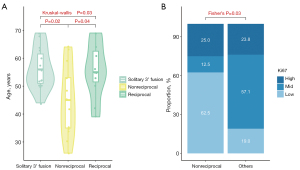 Finally, we explored the associations between clinicopathologic features and fusion groups. A significant association was found between the nonreciprocal group and age at diagnosis, with median ages of 56.0 years for the solitary 3' fusion group, 45.0 years for the nonreciprocal group, and 55.0 years for the reciprocal group (P=0.03, Figure 3A and Table S1). Post-hoc Bonferroni analysis further confirmed that the nonreciprocal group was younger than both solitary 3' fusion group (P=0.02 after adjustment) and the reciprocal group (P=0.04 after adjustment, Figure 3A). Patients in the nonreciprocal group exhibited a lower median age compared to all other subgroups combined (P=0.01, Table S2). Moreover, this subgroup exhibited a lower Ki67 proliferation index (P=0.03, Table S2 and Figure 3B). No statistically significant associations were found for all other clinical indicators across the fusion groups.