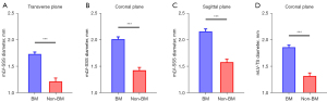 After gadolinium injection, BB-MRI showed that the mLVs surrounding the SSS and TS were consistently thicker in the BM group than in the non-BM group across all planes (all P values <0.001; Table 2) (Figure 4).