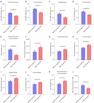 Statistical analyses were performed using SPSS 26.0 (IBM, Armonk, NY, USA) and R 4.4.1 (The R Foundation for Statistical Computing). Nomogram, calibration, and decision curve analysis (DCA) were generated with the “rms” package in R. Two-sided P<0.05 was considered significant. Continuous variables were summarized as the mean ± standard deviation (SD) and categorical variables as counts and percentages. Between-group comparisons (BM vs. non-BM) for continuous measures [e.g., mLV diameter and perivascular space volume fraction in white matter (PVSVF/WM)] were performed via independent-samples t-tests. Within-group pretreatment-posttreatment comparisons were performed separately in the SD + PR and PD subgroups via paired t-tests. Between-subgroup differences in change scores (Δ = pretreatment − posttreatment) were compared with independent-samples t-tests. Categorical variables were compared with the Pearson χ2 test. Bonferroni adjustment was applied within families of related tests (e.g., multiple planes/regions of mLV diameter).