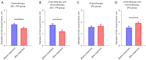 Figure 3 Typical example from each of the SD + PR group and the PD group. (A) Comparison of mLV diameter measurements before and after treatment in a patient with brain metastases in the PD group. (B) Comparison of mLV diameter measurements before and after treatment in a patient with brain metastases in the PR group. The yellow arrows in the figure indicate the thickest points of the mLV. mLV, meningeal lymphatic vessel; PD, progressive disease; PR, partial response; SD, stable disease.