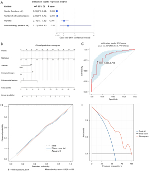Figure 7 Clinical prediction nomogram and model performance. (A) The forest plot of factors obtained through multivariate logistic regression analysis for FTR. (B) The nomogram established for prediction of FTR. Nomogram integrating mLVtotal, gender, number of extracranial lesions, and immunotherapy exposure to estimate the probability of favorable therapeutic response in patients with NSCLC brain metastases. Each variable is assigned points on the upper scale; the summed points correspond to the predicted probability on the lower scale. (C) Multivariate logistic regression results with ORs and 95% CIs. The ROC curve of the multivariate model is shown (AUC =0.847; 95% CI: 0.771–0.923). Operating points are presented as threshold (specificity, sensitivity). 0.660 (0.864, 0.714) indicates a threshold of 0.660 yielding a specificity of 0.864 and a sensitivity of 0.714. (D) Calibration curves for the FTR of nomogram predictions. (E) Decision curve analysis demonstrating superior net clinical benefit of the nomogram across threshold probabilities of 0–100% compared with the treat-all or treat-none strategies. AUC, area under the curve; CIs, confidence intervals; FTR, favorable treatment response; mLVtotal, total meningeal lymphatic vessel diameter; NSCLC, non-small cell lung cancer; ORs, odds ratios; ref., reference; ROC, receiver operating characteristic.