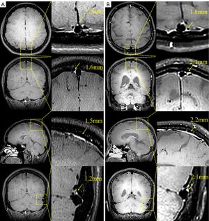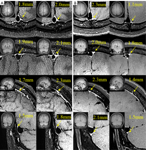 Figure 2 The process of mLV measurement in the BM and non-BM groups. (A) mLV measurements with the BB sequence in a patient without BMs. (B) mLV measurement with the BB sequence in a patient with BMs. The yellow arrows in the figure indicate the thickest points of the mLV. BB, black-blood; BM, brain metastasis; mLV, meningeal lymphatic vessel.