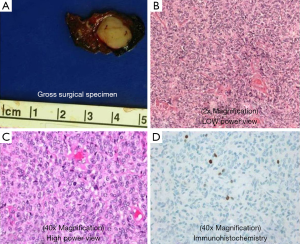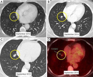 A 52-year-old lifetime non-smoker female with no significant past medical and surgical history presented for a routine follow-up of a right lower lobe solitary pulmonary nodule. This nodule was incidentally detected on a CTA chest performed in 2012 to rule out a pulmonary embolus (Figure 1). After the initial scan in 2012, the patient was lost to follow-up for two years and presented again in 2014. CT scan of the chest now showed that the right lower lobe non-calcified pulmonary nodule had grown in size (Figure 1B). A one year follow-up with a CT scan of the chest showed that the lung nodule had doubled in size over three years, highly suspicious for malignancy (Figure 1C). PET/CT showed mild uptake in the enlarging pulmonary nodule (Figure 1D). Subsequently, a CT-guided biopsy of the nodule revealed a carcinoid tumor (Figure 2). Next, the patient underwent a right middle lobectomy with an uncomplicated recovery (Figure 3A). Pathology results showed a well-differentiated NET with more than 2 mitoses per 10 hpf with no atypia or necrotic foci (Figure 3B,C), consistent with an atypical lung carcinoid. Tumor cells stained positive for cytokeratin 7, TTF-1, chromogranin A (CgA), synaptophysin, and negative for CK20, with Ki-67 proliferation index of 1% (Figure 3D), consistent with a lung carcinoid. Follow-up imaging showed no local spread or distant metastases. The patient is disease free till date, consistent with cure.