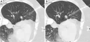 Diagnosis and classification of NETs is challenging. The role of IHC and imaging are used to aid in the diagnosis. All NETs show the typical neuroendocrine morphology in the form of Kulchitsky cells in small clusters or rarely, isolated and ACs are required to show an additional 2–10 mitoses per 2 mm2 of viable area of tumor with necrosis (4). Necrosis is typically located at the center of the tumor nodule (4). Mitoses <2 would signify a TC and >10 would signify LCNEC (4). Carcinoid tumors can be diagnosed with cytological assessment, but differentiating between ACs and TCs requires a resected specimen (4). IHC can strengthen the diagnosis in cases of equivocal histology. Common NET IHC markers are chromogranin A (CgA), CD56, synaptophysin, and neuron-specific enolase. CgA can be used to detect tumor recurrence as it is associated with tumor burden, but this should be done with caution as unrelated factors can cause CgA levels to rise (4). Since the release of the 7th edition of TNM staging criteria designed by the American Joint Committee on Cancer, carcinoid tumors now have TNM parameters (same as for NSCLC) (4). Interpretation of the minor histological differences between the various NETs leads to interobserver variability and delays accurate diagnosis (3). ACs are more likely to have delayed diagnosis because more than 90% usually present as non-functional (no hormone production) incidental peripheral lung tumors (5). In a study about patient perspective of their NET diagnosis, 50% of the 222 patients reported a period up to two years between symptom presentation and diagnosis (6). In a 2015 study, ACs were shown to be more aggressive than TCs with poorer 5- and 10-year survival rates (7). The delay in diagnosis allows for local tumor invasion as well as distant osseous and hepatic metastases. Imaging is used to localize and stage the tumor. According to the European Society of Medical Oncology, CT or MRI should be performed annually in patients with AC/TC who have had surgical resection or every three months after initiating medical treatment (8). What imaging cannot do is different between ACs and TCs—this requires nuclear imaging. Somatostatin receptor scintigraphy (SR) with radiolabeled somatostatin analogue (SSA) would not only help find tumor sites, but it would prove the presence of SRs and help narrow down medical management options (9). PET scans with 68Ga-DOTATATE and 68Ga-DOTATOC have a higher sensitivity and specificity than the octreoscan for SRs imaging (9). 18F-fluorodeoxyglucose PET/CT has been a suggested imaging modality for tumors with a Ki-67 index >10% (8). Radiologists have the ability to play a vital role in the care of patients from diagnosis to treatment to post-treatment monitoring. The current grading protocol classifies NETs as grade 1 (TCs), grade 2 (ACs), and grade 3 (SCLCs and LCNECs). Hormonally active grade 1 and 2 tumors are usually started on SSA treatment (2,5). SSA resistant tumors may benefit from additional serotonin synthesis inhibitor, telotristat etiprate (10). Grade 3 tumors are initially treated with chemotherapy (3). There is also recommendation for use of adjuvant chemotherapy in stage II/III AC patients. Ultimately, surgical resection is the only curative option for patients with resectable tumors or minimally metastatic disease. The goal should be tumor removal with maximal lung parenchyma preservation. AC patients status post resection continue to have a lower 5- and 10-year survival rate compared to TC patients due to increased risk of metastases and recurrence (2,4,5). The increased rate of nodal involvement with ACs warrants lymph node dissection even in patients with N0 disease (11). Current guidelines created by the Fleischner Society (Table 1), direct radiologists for follow up of incidental pulmonary nodules, which is often how NETs are discovered (12). However, the degree of adherence to these guidelines remains largely unexplored. A quality improvement study at a major academic tertiary hospital discovered that their radiologists’ adherence to the Fleischner guidelines was 82.8% which is relatively higher than rates reported at other institutions. Researchers attribute the increased adherence rates to a laminated printout of the Fleischner guidelines at each PACS station and reinforcement through resident learning events (13). These types of departmental efforts to reinforce the Fleischner guidelines are not readily implemented at every institute. One study found that only 29% of emergency department (ED) CT pulmonary angiography reports that explicitly stated a follow-up protocol of an incidental pulmonary nodule were actually followed up (14). There are greater systemic issues at play than the radiology report when it comes to poor patient follow-up: inadequate interdepartmental communication, pressure for rapid patient turnover, radiologists’ inattention to detail, irrelevance of finding to acute condition, lack of primary care access, and patient demographics (14). These are real-life problems that lead to poor follow-up and can have grave consequences for patients (14). The purpose of this case report is to reinforce the importance of follow-up in a patient who is diagnosed with a lung nodule and offer an improved form of follow-up communication inspired by the post-mammography patient correspondence protocol at our institute. We propose sending a letter to the patient in layman terms, directly from the Radiology Department to reinforce the importance of timely follow up, which will complement the information provided to the patient from their primary care physician or pulmonologist’s office.