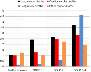Numerous studies have shown that the presence of airflow limitation confers between a 2–6-fold increase in the risk of lung cancer depending on the study design and definition of COPD (20-23). Notably, spirometry-defined COPD confers a greater risk of lung cancer relative to the risk associated with self-reported COPD, particularly when compared to “healthy smokers” confirmed with spirometry, and matched for age and smoking history (19,21). We have shown that between 15–30% of randomly selected smokers over 40 years old have underlying COPD based on spirometry, whereas 60–85% of unscreened lung cancer case series have features of COPD, whether based on spirometry alone or combined with image-based emphysema (22-25). In a large prospective study by Mannino and colleagues, a clear linear dose-response relationship was found between increasing severity of airflow limitation and risk of lung cancer (21). In addition, this study showed that a restrictive pattern was also independently associated with an increased risk of lung cancer. We have replicated this finding showing that with increasing severity of airflow limitation, the risk of lung cancer increased in the NLST-ACRIN sub-study (Figure 2) (19). Indeed, we also replicated the findings of a 1977 study by Burrows and colleagues showing that a reduced FEV% predicted conferred a greater risk than that of age and pack years (20). The increase in lung cancer risk associated with a reduction in FEV1%predicted occurs somewhere between 80–90% of predicted, indicating the increase in risk for lung cancer occurs well before symptoms of airflow limitation are clinically evident or detected (19,23). This has relevance to the current interest in assessing the risk of lung cancer in high risk smokers eligible for CT-based lung cancer screening (26-28), yet spirometric screening of asymptomatic smokers for the presence of airflow limitation is not recommended. The currently accepted paradigm is that those at greatest risk of lung cancer get the most benefit from lung cancer screening because more lung cancer cases are identified in this group compared to those at lower risk (29,30). Without spirometry, this risk-based approach to lung cancer screening completely overlooks the relevance of pre-existing COPD in those developing lung cancer (5,26). Compared to those with “normal lungs”, we have shown in a post-hoc analysis of the NLST-ACRIN sub-study that those with COPD have both a greater risk of dying of lung cancer and a greater likelihood of dying of a non-lung cancer complication of smoking (6). These include dying of cardiovascular disease, respiratory disease and other cancers (see Figure 3), which represents the “competing cause of death” effect (discussed further below).