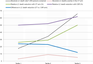 As outlined above, the two outcomes best describing a benefit from CT screening come from lung cancer deaths averted per persons screened (absolute benefit) and percent reduction in lung cancer deaths (relative benefit) (8). From a cost- effective or efficiency perspective, the absolute reduction in lung cancer deaths averted per 1,000 persons screened provides a good basis for assessing outcomes (Table 2). Describing the number needed to screen to avert one lung cancer death provides another means of assessing the benefits of screening in the CT arm versus the CXR arm.