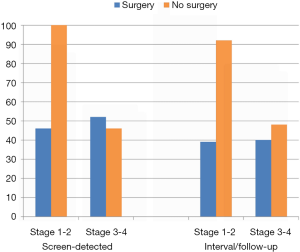 A second important feature of having COPD at the time lung cancer is identified during screening is its effect on operability (33). Lung cancer cases with significant comorbid disease are generally declined surgery. In the NLST-ACRIN substudy, we found COPD prevalence was 34% overall and 52% in lung cancer cases (GOLD 1 =10%, GOLD 2 =27% and GOLD 3–4 =14%) (10). It is noteworthy that the NLST protocol excluded patients who were oxygen-dependent. We found operability for stage 1–2 lung cancers in the NLST-ACRIN sub-study was consistent at about 90%, regardless of COPD grade (severity), for those cancers identified by the screening (defined as screen-detected lung cancers). The likelihood of operability was drastically reduced according to COPD status for those cancers identified during interval and follow-up periods (Figure 5). This indicates that operability is profoundly affected by the presence of COPD and that this may contribute to the reduced benefits of CT screening in this group. In this regard, when we stratified NLST-ACRIN screening participants according to the presence of airflow limitation, we found the % reduction in lung cancer mortality was 15% and 28% in those with and without COPD respectively (Table 4) (47). When we stratified COPD patients into those with undiagnosed COPD (N=2,209) and those with diagnosed COPD (N=1,213), we found that those with undiagnosed COPD had a two-fold greater reduction in lung cancer deaths compared to those with diagnosed COPD (32% vs. 17%, P<0.05) (Table 4). This finding and its implications will be described in more detail below.