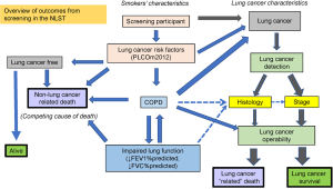 In a simple paradigm of lung cancer screening, it is too easy to view the success of CT-based screening as increasing the number (or proportion) of non-small cell lung cancers identified (i.e., excluding small cell), at an operable stage (stage 1 and 2), which will lead to improved survival by surgical removal. However, little consideration is given to factors undermining this such as co-morbid disease, inoperability and competing causes of death. This review has focused on these important features and shown how they relate to COPD and off-set the benefits of screening. In Figure 6, we show that there are many inter-related factors that can alter outcomes of CT screening that may serve to profoundly undermine the benefits of CT-based screening. We also suggest that the presence of COPD, based on spirometric assessment, is not only closely related to both inoperability and competing cause of death, but represents one of the most important comorbid conditions affecting outcomes from CT screening.