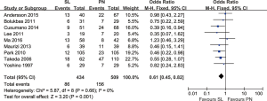The meta-analysis {13 trials reported this data include 22 [839] and 130 [2,064] patients in SL and PN} showed operative mortality in the PN group was significantly higher than in the SL group (6.30% vs. 2.62%) (OR: 0.40; 95% CI: 0.25–0.63; P<0.0001), with no evidence of significant heterogeneity.