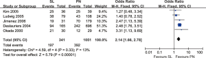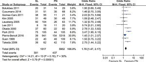 Five-year survival rates: the meta-analysis (20 trials reported this data) showed that survival in PN group as significantly lower compared to SL one (OR: 1.96; 95% CI: 1.70–2.27; P<0.00001), with specific heterogeneity (Figure 4).