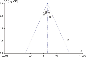 Funnel plots of the study results are shown in Figure 6. The funnel plots on 5-year overall survival rates following SL or PN for the treatment of NSCLC showed symmetry, which suggested there was no publication bias.