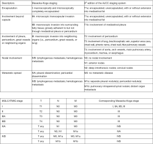 - Detterbeck FC, Stratton K, Giroux D, et al. The IASLC/ITMIG Thymic Epithelial Tumors Staging Project: proposal for an evidence-based stage classification system for the forthcoming (8th) edition of the TNM classification of malignant tumors. J Thorac Oncol 2014;9:S65-S72. [Crossref] [PubMed]