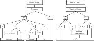 In the TNM staging system, Masaoka I, II and some stage III TETs correspond to stage I (T1N0M0) tumours. Major problem regarding PORT is to identify Masaoka-Koga stage II and III tumours within the TNM stage I group. The recommendation of the current ESMO guidelines is to keep decision-making based on the Masaoka-Koga system for PORT—until more data is available.
