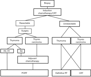 The optimal therapy for TETs should be determined at a multidisciplinary setting (23-26). Treatment strategy for TET is primarily based on whether the tumour is resected upfront. The evaluation of resectability is based on tumour size and the surgeon’s expertise. TNM staging may even assist in estimating resectability: stage T1-3 refers to an extension amenable to surgical resection, while stage T4 is mostly considered unresectable (25).