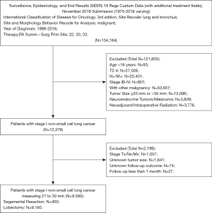 Data of patients who underwent segmental resection (surgery of primary site code: 22) and lobectomy (surgery of primary site codes: 30 and 33) for primary lung cancer between 1998 and 2016 were obtained from the SEER 18 Regs Custom Data (with additional treatment fields). Patients aged <18 years, with additional synchronous malignancies, diagnosed with pulmonary neuroendocrine tumors or melanoma (i.e., carcinoid, large cell neuroendocrine tumor, small cell lung cancer), who received neoadjuvant or intraoperative therapy, or who had incomplete clinicopathological or follow-up information, were excluded. In addition, since this study focused on patients with stage IA NSCLC with a tumor size of >20–30 mm,patients with nodal involvement, distant metastases, or a tumor size ≤20 mm or >30 mm were also excluded from the final analysis. Figure 1 shows the detailed screening process.