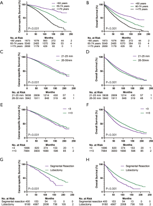 During follow-up (median: 48.0 months; range, 0–227 months), 2,075 patients died from lung cancer-specific causes, and 2,380 patients died due to other causes. The 5-year CSS and OS rates for stage IA (21–30 mm) patients were 84.1% and 63.6%, respectively. In univariate survival analysis (Table 2), lobectomy was associated with significant survival benefit in both CSS and OS (median CSS, 165 vs. 119 months, P<0.001; median OS, 94 vs. 61 months, P<0.001). Univariate analysis also revealed that age (Figure 2A,B), year of diagnosis, sex, race, tumor size (Figure 2C,D), histology, grade, number of dissected lymph nodes (Figure 2E,F), insurance, and marital status were significant prognostic factors for CSS and OS. Meanwhile, postoperative radiation and chemotherapy were associated with worse OS (all P<0.001), but were not associated with worse CSS.