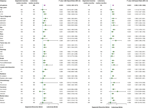 Forest plot analyses for age, year of diagnosis, sex, race, tumor size, histology, lymph node dissection, radiation, chemotherapy, insurance, and marital status showed that lobectomy for stage IA (21–30 mm) NSCLC was associated with improved CSS and OS in most subgroups (Figure 3). Notably, in the subgroup of patients aged <60 years or of the black race, the segmental resection group demonstrated comparable CSS [hazard ratio (HR), 0.974, 95% confidence interval (CI): 0.401–2.366, P=0.954; and HR, 1.014, 95% CI: 0.414–2.480, P=0.976; respectively] and OS (HR, 1.141, 95% CI: 0.714–1.824, P=0.579; and HR, 1.053, 95% CI: 0.616–1.798, P=0.850, respectively) to the lobectomy group.