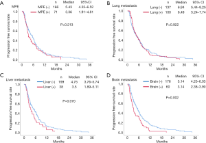 The log-rank test revealed no differences in the median PFS of patients who received DOC plus RAM concerning MPE (positive vs. negative) (Figure 4A), lung metastasis (positive vs. negative) (Figure 4B) and liver metastasis (positive vs. negative) (Figure 4C). The median PFS of patients with brain metastasis (positive vs. negative) was significantly different [3.14 (95% CI: 2.38–3.90) vs. 5.14 (95% CI: 4.25–6.03) months; P=0.002] (Figure 4D).