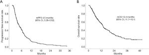 In all patients, the ORR, DCR, and progressive disease rate were 25.2%, 63.9%, and 36.1%, respectively. At the time of analysis, the PFS was based on 195 events (82.3% maturity), whereas the OS was based on 148 events (62.4% maturity). The median follow-up time in censored patients was 12.5 months (range, 3.1–42.6 months). The median PFS was 4.5 (95% CI, 3.36–5.62) months (Figure 1A) and the median OS was 13.4 (95% CI, 11.7–15.1) months (Figure 1B).