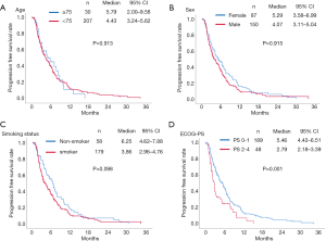 The log-rank test revealed no differences in the median PFS of patient treated with DOC plus RAM in terms of age (<75 vs. ≥75) (Figure 2A), sex (male vs. female) (Figure 2B), and smoking status (non-smoker vs. smoker) (Figure 2C). Conversely, the median PFS in ECOG-PS groups (0–1 vs. 2–4) were significantly different [5.46 (95% CI: 4.42–6.51) vs. 2.79 (95% CI: 2.18–3.39) months; P<0.001] (Figure 2D).