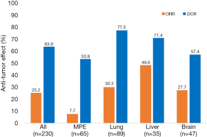 The ORR and DCR are listed by metastatic site in Figure 3. The ORR of DOC plus RAM for MPE was relatively low, and DOC plus RAM seemed to be unable to decrease pleural effusion. However, about 50% of patients were able to prevent an increase in pleural effusion. The ORR and DCR for lung and liver metastasis were higher than those in all patients, showing 30.3% and 77.5%, and 48.6% and 71.4%, respectively. The ORR and DCR for brain metastasis were almost the same as those of all patients. Of 60 patients with brain metastases, 52 patients (86.7%) received palliative treatment in addition to DOC plus RAM. Among these, five patients underwent surgery and 48 received radiation therapy, with one patient receiving both therapies.