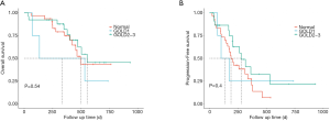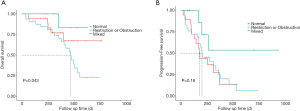 When OS and PFS based on ventilatory defect types were compared to the normal lung function group, patients with mixed ventilatory defects tended to have better OS (P=0.043, Figure 5A) and PFS (P=0.18, Figure 5B).