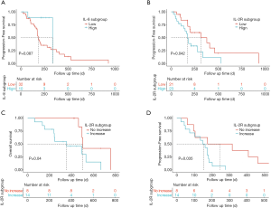 Continuous data were presented as mean [standard deviation (SD) or median interquartile range (IQR)]. Chi-squared or Fisher’s exact tests was used to compare categorical variables across subgroups. Statistical comparisons between continuous variables were performed with an independent Student’s t-test for normally distributed data; otherwise, the Mann-Whitney U test or Kruskal-Wallis Test was used. In order to better detect the association between baseline cytokine levels and antitumor activity, we used median values or time dependent receiver operating characteristic (ROC) curves analysis to specify the cut-offs for interleukin (IL)-8 and IL-2 receptor (IL-2R). The cumulative rate of OS or PFS was estimated using the Kaplan-Meier method with log-rank test. Time to events were measured from the date of the start of treatment until death or last visit.