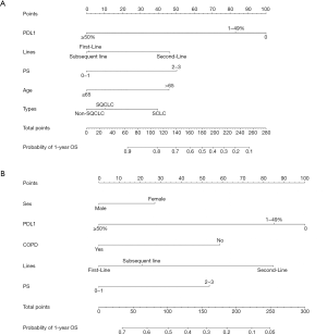Nomograms were established based on the independent prognostic factors derived from our final multivariate models (Figure 7). The OS nomogram included the following variables: PD-L1 expression, treatment line, PS, age, and cancer type (Figure 7A). For the predicted PFS nomogram, we further added sex and COPD variables without compromising the discriminative ability of the model (Figure 7B). The nomograms shed light on the important contribution of PD-L1 expression and treatment line for advanced-stage lung cancer, while PS and sex conferred a moderate influence on survival. One hundred was set as the maximum score of each variable; by adding up the total score and locating it on the bottom point scale, an estimated probability of survival could be easily determined.