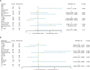 Multivariable Cox proportional hazards regression analysis revealed that second-line immunotherapy (adjusted HR, 2.068; 95% CI, 1.01–4.21) was significant risk factors associated with death in advanced lung cancer patients. PD-L1 expression of ≥50% (adjusted HR, 0.20; 95% CI, 0.061–0.64) was associated with lower death in advanced lung cancer patients (Table 2, Figure 1A). Second-line immunotherapy (adjusted HR, 2.31; 95% CI, 1.36–3.93) was prone to have decreased progression free time during immunotherapy. PD-L1 expression of ≥50% (adjusted HR, 0.37; 95% CI, 0.17–0.83) and diagnosed with COPD (adjusted HR, 0.56; 95% CI, 0.33–0.96) were associated with a lower risk of disease progression (Table 3, Figure 1B).