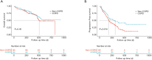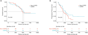 The adjusted HR was statistically significant for the presence of COPD (adjusted HR, 0.56; 95% CI, 0.33–0.96; P=0.034) in the multivariate Cox proportional hazard model adjusting for the most relevant variables. The Kaplan-Meier curves for COPD (including spirometry-defined COPD and physician-diagnosed COPD) and non-COPD patients are presented in Figure 2. The median OS in non-COPD patients was 510 days, while the median OS in COPD patients was non-reached. COPD patients tended to have a longer OS (Figure 2A). The median PFS in COPD and non-COPD patients was 316 and 186 days, respectively, and the difference was statistically significant (adjusted HR, 0.56; 95% CI, 0.33–0.96; P=0.018) (Figure 2B).