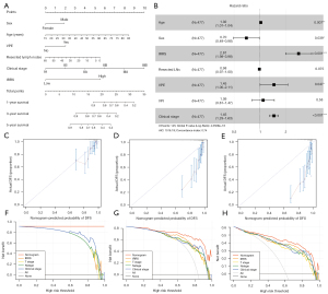 To construct a quantitative tool and personalize risk assessment to predict DFS, a nomogram integrating IRRS and clinicopathological characteristics, including sex, age, VTE, TNM stage, and the number of resected lymph nodes, was proposed utilizing the training dataset. The IRRS contributed slightly less to the risk points than the clinical stage, while similar to the prognostic effects of the number of resected lymph nodes (Figure 5A,5B). The calibration plots fitted well to the ideal curve in 1-year DFS, whereas it was not observed in 3- or 5-year DFS (Figure 5C-5E). The C-index of nomogram system (C-index =0.74, 95% CI: 0.70–0.78) was higher than the standard TNM stage (C-index =0.67, 95% CI: 0.64–0.71) and the IRRS model (C-index =0.60, 95% CI: 0.57–0.63), suggesting the nomogram algorithm improved the effectiveness of predictive model (Table 3). We further implemented the DCA, indicating that the nomogram added more benefit to predict patients’ DFS than IRRS system and TNM stage (Figure 5F-5H). Great calibrations were also illustrated for the probability of recurrence in 1-year DFS in the testing and entire cohort. Analogously, the prognostic nomogram showed better predictive capability than the standard TNM stage and the IRRS model (C-index =0.81 vs. 0.74 vs. 0.60 in the testing cohort; C-index =0.76 vs. 0.69 vs. 0.60 in the entire cohort) (Table 3, Figures S4,S5). Based on the above-mentioned findings, the IRRS model might be employed to reinforce the prognostic ability of the TNM approach.