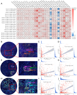 Figure 1 Spearman’s rank correlation between CD68-related biomarkers and other biomarkers in tumor nest and tumor stroma. (A) Spearman’s rank correlation matrix and corresponding P value between CD68-related biomarkers and various biomarkers in tumor and stroma. *, P<0.05; **, P<0.01; ***, P<0.001. (B) Merged immunofluorescence images show the expression profile of three biomarkers, including PDL1, CD8, and CD68. The dotted line graphs illustrate the correlations between (C) intratumoral CD68+PDL1+ and intratumoral CD8+CD133−; (D) intratumoral CD68+PDL1+ and intratumoral CD8 (POS). (E) Merged immunofluorescence images show the expression profile of three biomarkers, including CD68, CD163, and PDL1. The dotted line graphs illustrate the correlations between (F) intratumoral CD68+CD163+ and intratumoral PDL1 (POS); (G) intrastromal CD68+CD163+ and intrastromal PDL1 (POS). (H) Merged immunofluorescence images show the expression profile of two biomarkers, including CD68 and CD133. The dotted line graphs illustrate the correlations between (I) intratumoral CD68+CD163-PDL1− and intrastromal CD133 (POS); (J) intratumoral CD68+ and intratumoral CD133 (POS). Magnification of B,E,H: ×200.
