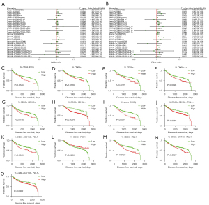 Figure 3 The prognostic values of CD68-related biomarkers. (A) Univariate Cox regression analysis and (B) multivariate Cox regression analysis evaluating the prognostic significance of CD68-related biomarkers for disease-free survival. Kaplan-Meier curves illustrate the prognostic implications of the proportion of CD68-related biomarkers (high vs. low) within tumor nest (C-M) and tumor stroma (N,O) for disease-free survival.