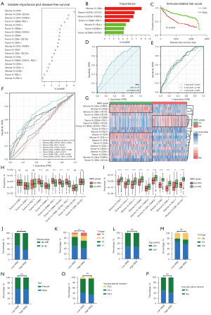 Figure 4 Construction the immune-related risk score (IRRS) by random forest (RF) model in the training cohort. (A) The importance of various variables within tumor nest and tumor stroma, evaluated by the value of Mean Decrease Accuracy (%lncMSE). (B) The importance feature map demonstrated the first rank of CD68-related biomarker in tumor nest. (C) Kaplan–Meier estimate of the disease-free survival based on IRRS (high IRRS group vs. low IRRS group) in the training cohort. (D,E) Time-dependent receiver operator characteristic (ROC) curves and area under curve (AUC) values indicated the accuracy of the IRRS model. (F) Comparison of the predictive performance between IRRS and single biomarkers using ROC curve analysis. (G) Immune landscape of two IRRS subgroups (high vs. low) illustrates distinct cellular characteristics. Infiltration disparities of two immune-related risk score subgroups (high vs. low) in tumor nest (H) and tumor stroma (I). Disparities of patients’ clinical characteristics of two IRRS subgroups (high vs. low) (J-P). IRRS, immune-related risk score; RF, random forest; %lncMSE, Mean Decrease Accuracy; ROC, receiver operator characteristic; AUC, receiver operator characteristic; ns, not significant; TPR, true positive rate; FPR, false positive rate.