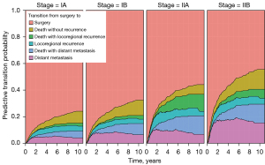 Figure 5 illustrates predictive transition probabilities from surgery to surgery, locoregional recurrence, distant metastasis, or death for an illustrative patient according to the pathological TNM stages of IA, IB, IIA, and IIB. This patient’s risk factors were set to age =67, histology = adenocarcinoma, sex = male, adjuvant treatment = no, smoking = current or former smoker, location = non-lower lobes, and surgery method = lobectomy. The height from the baseline to the fourth graph represents the probability of recurrence after surgery. The graph located at the bottom shows the probability of distant metastasis after surgery. Patients with higher stage lung cancer tended to have a high probability of recurrence; for example, at 5 years since surgery, the estimated transition probabilities of recurrence were 13.3%, 18.4%, 32.9%, and 36.6% for each of the pathological TNM stages of IA, IB, IIA, and IIB. In particular, patients with stage IIB lung cancer had a higher probability of distant metastasis after surgery than those with other stage lung cancers; for example, at 5 years since surgery, the transition probabilities of distant metastasis after surgery were 4.9% (95% CI: 2.5–9.7%), 7.8% (95% CI: 3.6–16.9%), 9.2 (95% CI: 3.3–25.8%), and 17.6 (95% CI: 8.5–36.5%) for each of the pathological TNM stages of IA, IB, IIA, and IIB. The supplementary forest plots contain the 95% confidence intervals along with the point estimates of the transition probability for each of the five transitions at 1, 2, 3, and 5 year(s) since surgery by the pathological TNM stages of IA, IB, IIA, and IIB (Figure S2).