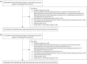 Demographic data, including age, sex, smoking status (current or former vs. never), and history other than lung cancer, were investigated. Tumor characteristics were investigated as follows: location (non-lower lobe vs. lower lobe), tumor-node-metastasis (TNM) staging, and histology (adenocarcinoma or squamous cell carcinoma). The right middle lobe was regarded as a non-lower lobe. The pathological TNM staging was re-evaluated according to the eighth edition of the American Joint Commission on Cancer staging system for lung cancer (9). Surgery was categorized into lobectomy, bilobectomy, and pneumonectomy. Finally, we investigated whether adjuvant treatment had been administered.