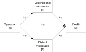 In traditional survival analysis, the disease process is expressed only in the ‘initial’ and ‘final’ states. However, events other than death such as recurrence or metastasis, which are called intermediate events, can occur during the disease process. It is expected that the outcome of patients who have experienced these intermediate events would be worse; therefore, it is desirable to use a model that considers intermediate events when predicting survival after surgery or identifying risk factors for death. In this study, we propose a multi-state model in which the ‘locoregional recurrence’ and ‘distant metastasis’ states are inserted between the initial and final states to provide a more detailed description of the disease pathway of lung cancer surgery patients (8).
