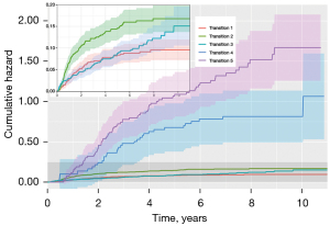 Figure 3 displays the Nelson-Aalen estimates of the cumulative transition hazards along with the 95% confidence intervals for all the five transitions. Note that the slope of each curve reflects the transition hazard that transitions to the subsequent state. As seen in the enlarged image in Figure 3, the transition hazard of death without recurrence remains constant after surgery, but the transition hazards of recurrence tend to be constant until approximately 2 years after surgery and then decrease. For example, at 2 years after surgery, the cumulative transition hazard of having experienced locoregional recurrence and distant metastasis was 0.502 (95% CI: 0.039–0.070) and 0.104 (95% CI: 0.085–0.128), respectively. Moreover, patients with recurrence have a much higher risk of death than patients without recurrence, and between the two types of recurrence, ‘distant metastasis’ was more exposed to death than ‘locoregional recurrence’. For example, at 5 years after surgery, the cumulative transition hazards of death without recurrence, death with locoregional recurrence, and death with distant metastasis were 0.088 (95% CI: 0.068–0.112), 0.678 (95% CI: 0.436–1.053), and 1.09 (95% CI: 0.846–1.404), respectively.