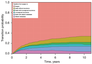 *, Transition 1: surgery to locoregional recurrence, Transition 2: surgery to distant metastasis, Transition 3: surgery to death without recurrence, Transition 4: locoregional recurrence to death, Transition 5: distant metastasis to death.