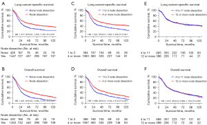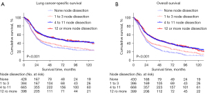 This study had several limitations. First, the SEER database does not provide information about several factors associated with survival, including the patient’s performance status, smoking history, comorbidities, pulmonary function, surgeon’s experience, institutional volume, clinical-stage, surgical approach (video-assisted or open procedures), resection margin, immunotherapy and induction therapy details (35). Second, many cases have been excluded after the propensity score matching process that could jeopardize the validity of the results since the population in the analysis do not represent their parent group of cases (36). While most of the available variables were well balanced in the propensity score-matched analysis, several subgroup variables were adjusted in the regression model, including the year of diagnosis, N stage, and surgical procedure. Third, the SEER database records the total number of dissected LNs and does not discriminate between LN sampling and systematic LN dissection. Thus, it is possible that some of the LNs in our data set were fragments, and the correct number of LNs may have been overestimated. This ambiguity regarding the dissected LNs may limit the determination of the optimal number of dissected LNs (16). Thus, we included the appropriate LN ranges in the study.