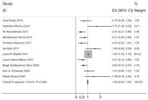 Heterogeneity of the individual HRs was calculated with Chi-squared tests according to Peto’s method (11). Meanwhile, heterogeneity test with I2 statistic and Q statistic was performed. All the studies included were categorized by patient race, histology, disease stage. Individual meta-analysis was conducted in each subgroup. If HRs were found to have fine homogeneity, a fixed effect model was used for secondary analysis; if not, a random effect model was used. In this meta-analysis, DerSimonian-Laird random effects analysis (12) was used to estimate the effect of estrogen receptor overexpression on survival. By convention, an observed HR >1 implies worse survival for the group with estrogen receptor overexpression. The impact of estrogen receptor on survival was considered to be statistically significant if the 95% CI did not overlap with 1. Horizontal lines represent 95% CIs. Each box represents the HR point estimate, and its area is proportional to the weight of the study. The diamond (and broken line) represents the overall summary estimate, with CI represented by its width. The unbroken vertical line is set at the null value (HR =1.0).