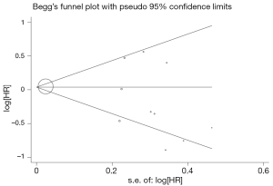 Begg’s funnel plot and Egger’s test were performed to assess the publication bias in the literature. All five eligible studies investigating NSCLC patients yielded a Begg’s test score of P=0.274 and an Egger’s test score of P=0.183, meanwhile according to the contour-enhanced funnel plot (Figure 2), the absence of publication bias was found in all eleven studies. These results suggest that there is no publication bias.