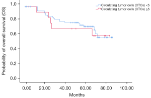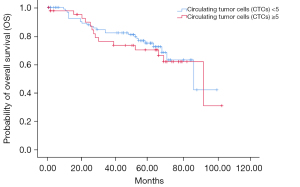 We found no differences between the patients who had five or more postsurgical CTCs and patients who had fewer than five postsurgical CTCs with respect to relapse (26.7% vs. 29.5%, P=0.83), OS, with an HR of 1.01 (0.91–1.12, P=0.808), or DFS, which had an HR of 0.95 (0.91–1.10, P=0.952). OS is shown in Figure 4.