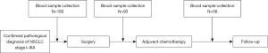 We performed a prospective, single-center study of 180 consecutive patients with resected and pathological confirmed stage I to IIIA (TNM AJCC/UICC 8th edition) NSCLC. An initial sample was collected from radial venous blood between tumor diagnosis and surgery between 2013 and 2018. A second sample was collected between 7 days and 6 months after surgery. In 56 patients, we collected a third blood sample after they had completed adjuvant chemotherapy (Figure 1). All patients were followed up to monitor their survival.