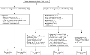 EMN-TTNB samples indicating non-malignant or indeterminate conditions on pathological examination were referred to as “negative” cases. In these cases, according to the judgment of the physician, short-term follow-up with chest CT or another type of biopsy was performed. The following cases were defined as “false-negative”: (I) repeat biopsy, such as surgical, CT-guided PCNB, and bronchoscopic proved malignancy, (II) follow-up chest CT within 1 year showed progression, (III) lung cancer was confirmed from a non-index lesion, and (IV) patient was treated as having lung cancer without pathological confirmation. In contrast, the following cases were defined as “true-negative”: (I) other diagnostic tests confirmed non-malignancy, (II) the lesion improved without cancer treatment, and (III) follow-up chest CT up to 1 year did not show progression.