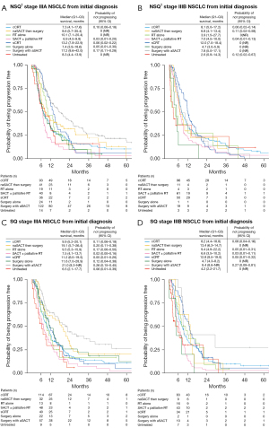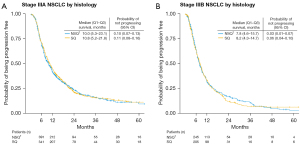 Median PFS was approximately 10 months in stage IIIA NSCLC and 8 months in stage IIIB NSCLC and was similar in patients with non-squamous and squamous histologies (Figure 3). Median PFS varied widely when patients were stratified by initial treatment used, and ranged from 3.9 (stage IIIB, non-squamous, radiotherapy alone) to 21.0 months (stage IIIA, squamous, surgery then adjuvant SACT) (Figure 4).