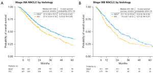 Median (Q1 to Q3) OS was lower in patients with stage IIIB than stage IIIA NSCLC and was also lower in patients with squamous than non-squamous NSCLC [27.6 (12.6 to 57.6) vs. 37.4 (16.3 to 79.7) months for stage IIIA and 19.4 (8.7 to 42.4) vs. 25.7 (12.0 to 55.6) months for stage IIIB, respectively] (Figure 1).