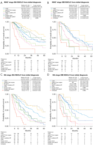 Median OS also varied when patients were stratified by initial treatment use, and ranged from 3.9 months (stage IIIB, non-squamous, radiotherapy alone) to 69.4 months (stage IIIA, non-squamous, neoadjuvant SACT then surgery) (Figure 2). Median OS for patients receiving neoadjuvant SACT then surgery was 69.4 (non-squamous) and 56.3 months (squamous) for stage IIIA and 48.2 months (non-squamous) for stage IIIB NSCLC (OS was not reached in patients with stage IIIB squamous histology). Median OS for patients receiving surgery with adjuvant SACT was 48.7 (non-squamous) and 59.0 months (squamous) for stage IIIA and 30.3 (non-squamous) and 56.9 months (squamous) for stage IIIB NSCLC. Median OS for patients receiving chemoradiotherapy ranged from 28.9 [stage IIIB (squamous)] to 38.9 months [stage IIIA (squamous)] (concurrent) and from 23.5 [stage IIIA (squamous)] to 27.7 months [stage IIIB (non-squamous)] (sequential) (Figure 2).